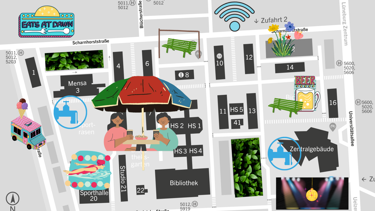 Ob Schwimmbad, Biergarten oder universitätseigener Club – den Studierenden und Teilnehmenden des Seminarplenums „Lüneburgs Lieblingsplätze - ein Experiment zur gemeinsamen Umgestaltung von Theatervorplatz und Campus“ scheint keine Vision eines neuen Lieblingscampus zu groß. Am heutigen Mittwoch allerdings beschränkt sich das Reallabor mitten auf dem Universitätsgelände auf Waffeln, Limo und Diskussion.