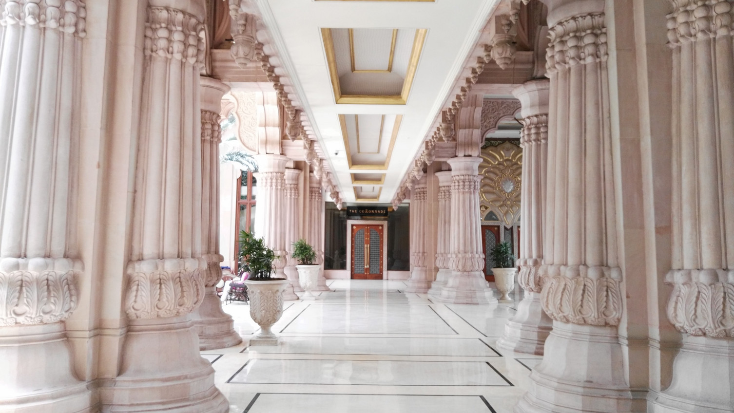 Es riecht dezent, dennoch erregend blumig. Weder Hundegebell noch ein Hupen, stattdessen ist ruhige Musik zu hören. Die massiven Säulen spiegeln sich im Marmorboden. Uns wird ein feuchtes, kühles, zitronig duftendes Handtuch angeboten. „Wenn Bundeskanzlerin Angela Merkel nach Bangalore kommen würde, würde sie in diesem Hotel untergebracht werden“, erklärt Giri, während sich der Pool präsentiert.
