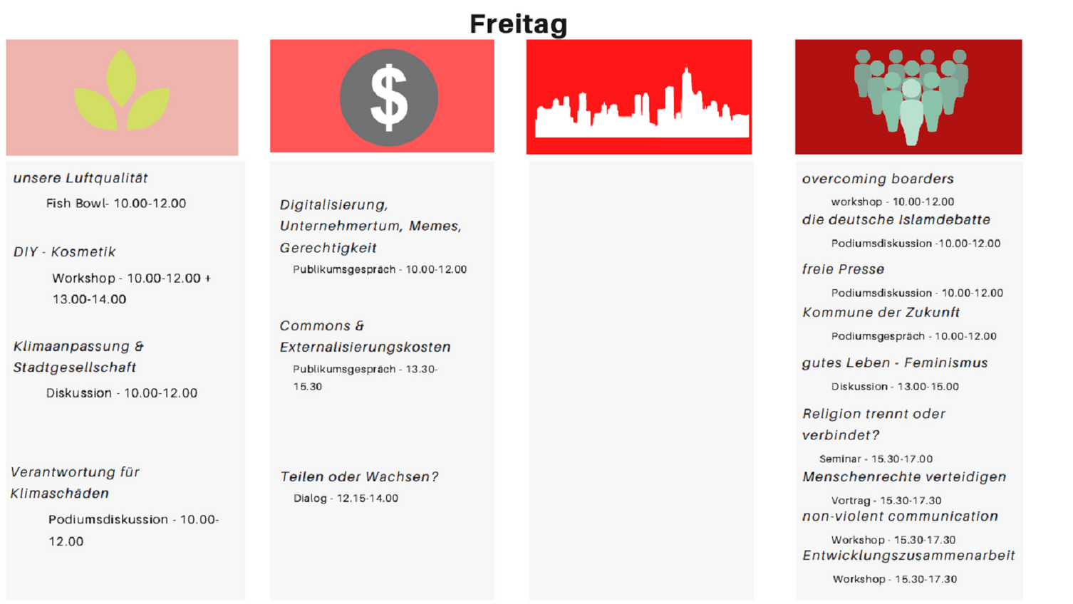 Wie schaffen wir es also gemeinsam als Menschheit das oberste Ziel des “guten Lebens” für alle möglich zu machen und gleichzeitig unsere Umwelt nicht aus den Augen zu verlieren? Dies ist wohl die ultimative Frage mit der wir uns auseinandersetzen müssen. Sie wird nicht einfach so beantwortet werden können - aber ein paar Vorschläge bleiben auch auf der Konferenzwoche nicht aus. Pasend dazu wird es eine interaktive Podiumsdiskussion zum Thema der deutschen Islamdebatte geben, einen gender equality Workshop, ein World Café zum Konzept der inklusiven Schulen und ein Gespräch mit dem Thema “Können Parteien Zukunft?” geführt.