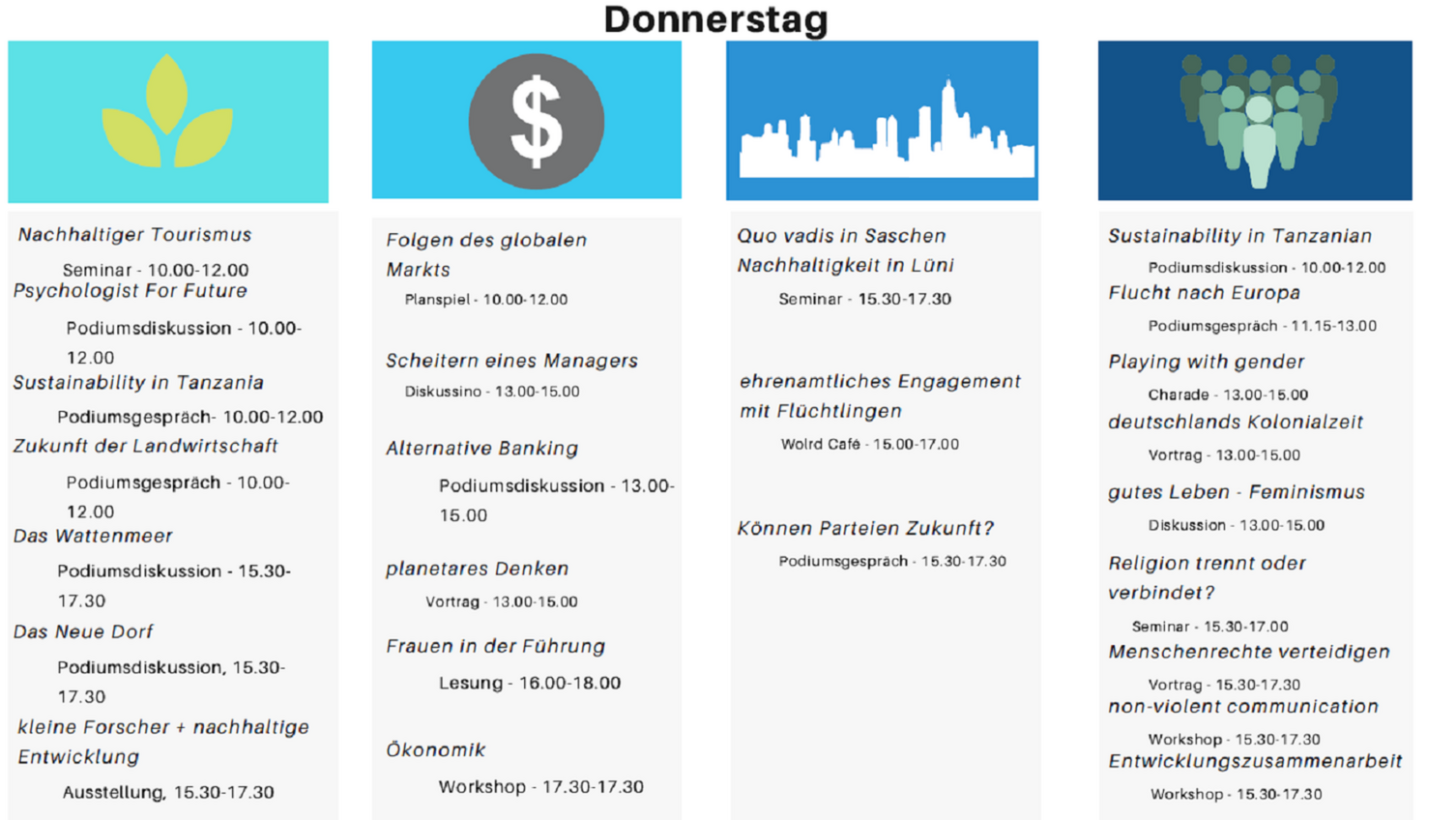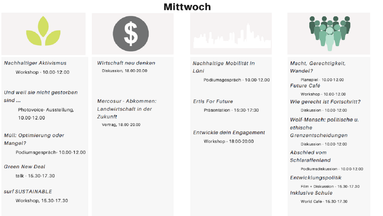 Natürlich macht es Spaß über Nachhaltigkeit und Wirtschaft im vollen Ausmaß zu sprechen, doch oftmals fehlt die Nähe zu solchen gigantischen Themenkomplexen. Daher werden in diversen Angeboten Nachhaltigkeit oder Wirtschaft mit Lüneburg verknüpft und konkretisiert. Es gibt eine Präsentation von “Erstis For Future”, ein Podiumsgespräch über nachhaltige Mobilität in Lüneburg oder ein Workshop um eigenes Engagement zu entwickeln.