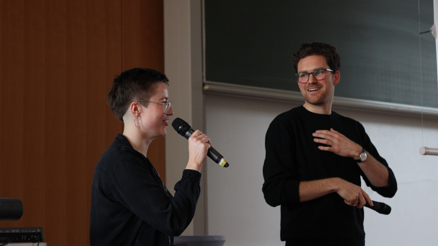 Es ist kurz nach 13 Uhr, eigentlich eine gute Zeit, um eine Mittagspause im vollen KoWo-Tag einzulegen. In Hörsaal 1 merkt man davon allerdings wenig: Die Reihen sind nahezu vollständig mit Studierenden und anderen Interessenten gefüllt, und die Atmosphäre ist sicherlich konzentrierter als bei so mancher Vorlesung, die sich außerhalb der Semesterferien hier abspielen könnte.