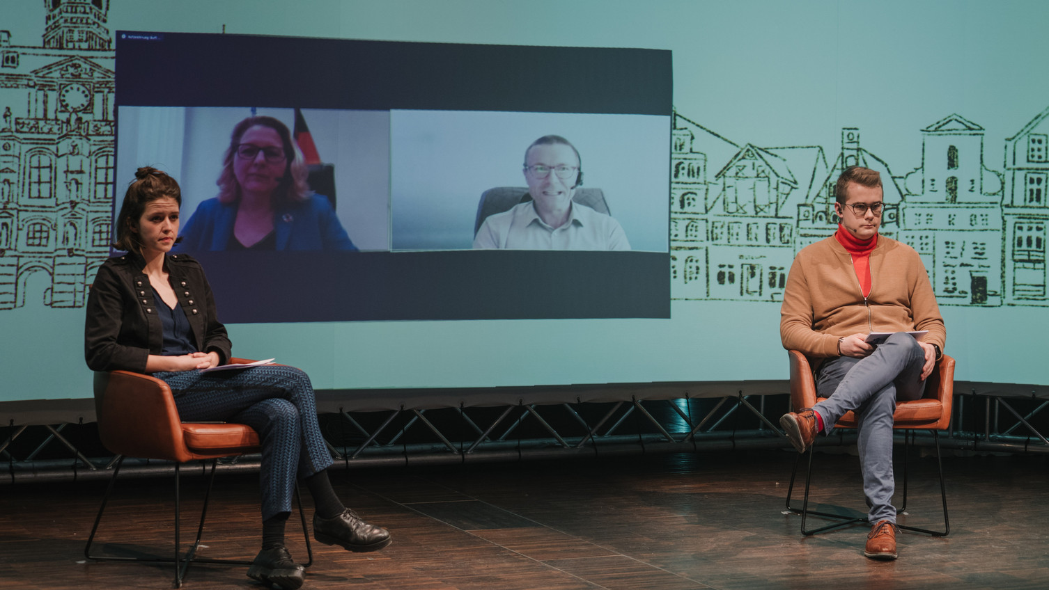 Mit Bundesumweltministerin Svenja Schulze und dem Wuppertaler Oberbürgermeister Uwe Schneidewind sind zwei prominente Gesichter aus der Politik geladen. Im gemütlichen Schreibtischstuhl vor der Webcam sitzend erhalten die Politiker:innen kaum Gegenwind. Wer zwei antithetische Positionen erwartet, wird enttäuscht.