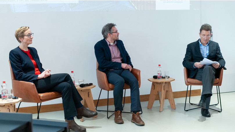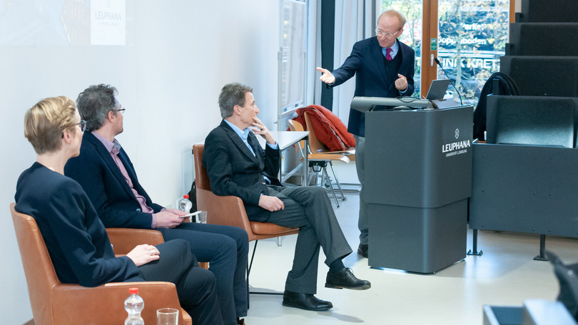 30.11.2022 „Wie lässt sich ein gerechter Frieden herstellen?“ Diese Frage diskutierten der Ethiker Prof. Dr. Wolfgang Huber aus Berlin und die Friedensforscherin Prof. Dr. Ursula Schröder vom Institut für Friedensforschung in Hamburg. Die Veranstaltung stand im Rahmen der Reihe „Ethik im Gespräch“, die vom Präsidium der Leuphana gemeinsam mit PD Dr. Thomas Kück vom Institut für Ethik und Theologie organisiert wird. Der Präsident der Leuphana, Prof. Dr. Sascha Spoun, eröffnete die Podiumsdiskussion, die von dem Lüneburger Politikwissenschaftler Prof. Dr. Tobias Lenz moderiert wurde. Im gut besuchten Hörsaal 4 waren Interessierte aus dem Hochschulleben und der Stadtöffentlichkeit zu einer Stunde aktueller und tiefgründiger Diskussion zusammen gekommen.
