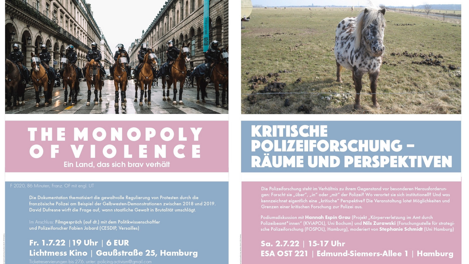 Ticketreservierungen bis 27.6. unter: policing.activism@gmail.com, Restkarten an der Abendkasse. Um auch vulnerablen Personen die Teilnahme zu ermöglichen, besteht Maskenpflicht.
