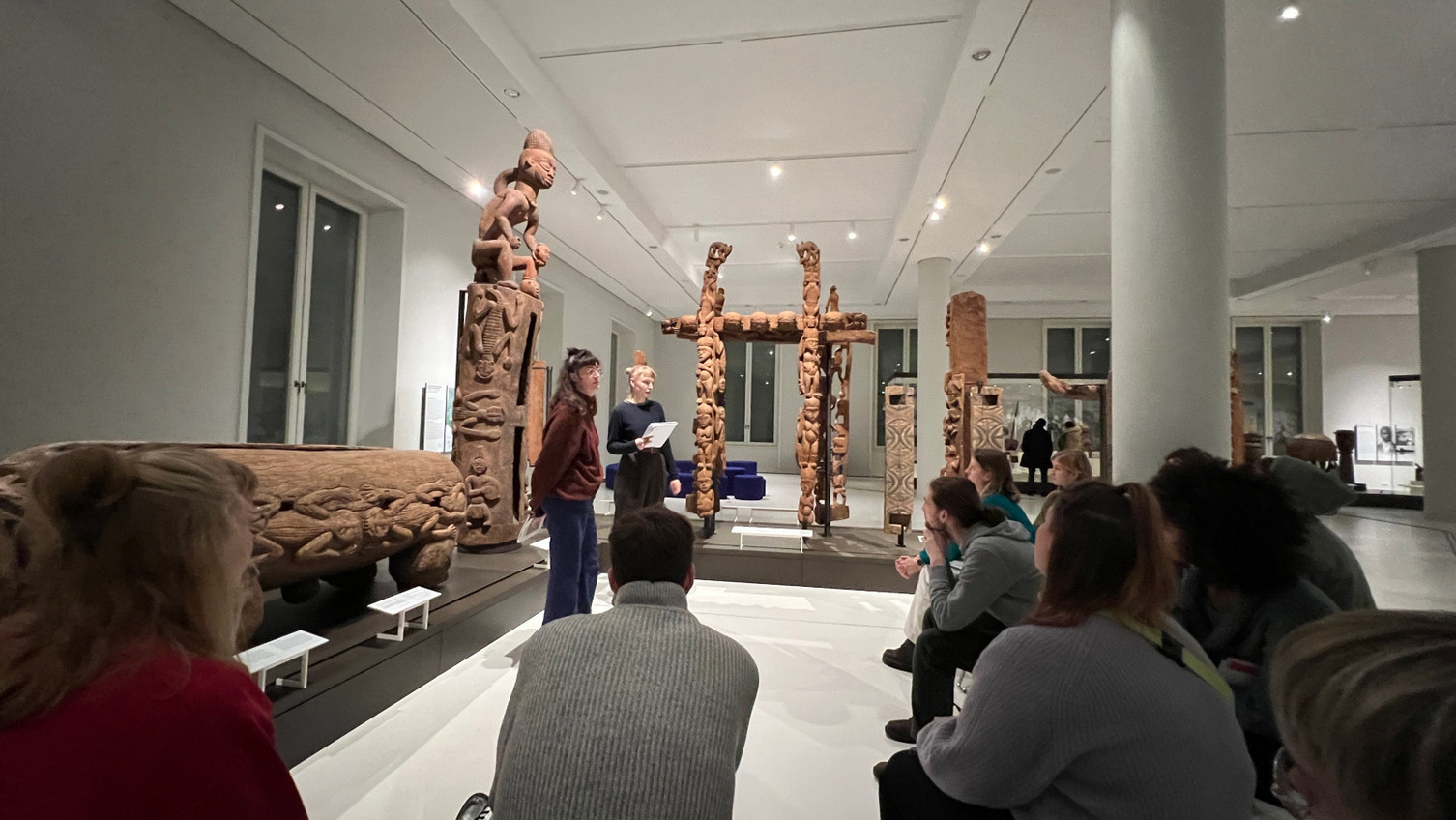 Im Sommer fand außerdem ein Gespräch zwischen Studierenden sowie einigen an der Ausstellungskonzeption beteiligten Forscher*innen und Kurator*innen statt. Das bot die Möglichkeit noch einmal weiterreichende Fragen wie der nach der Rolle von Provenienzforschung im Prozess der Ausstellungskonzeption und dem Stand der Zusammenarbeit mit Forscher*innen aus Herkunftsgesellschaften gemeinsam zu diskutieren.