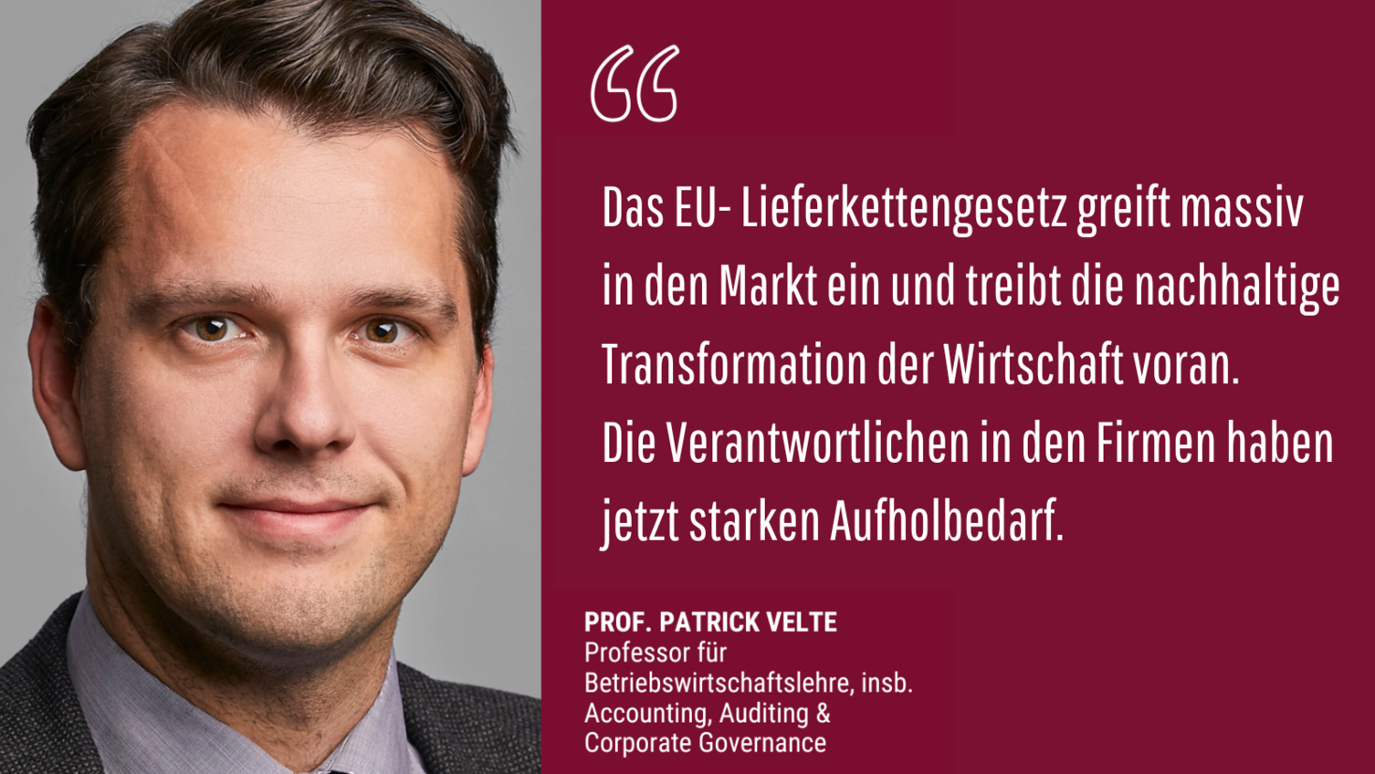 05.06.2024 Am 24. Mai hat der EU-Rat nach langen Kontroversen das neue Lieferkettengesetz beschlossen. Professor Patrick Velte, Inhaber der Professur für BWL, insbesondere Accounting, Auditing & Corporate Governance an der Fakultät für Management und Technologie hat den Prozess intensiv begleitet. Als die neue Richtlinie auf der Kippe stand, veröffentlichte er mit rund 100 internationalen Forschenden einen Aufruf zur Annahme. In der Rubrik „3 Fragen an“ zieht er ein Fazit der Entwicklungen und kommt zu dem Schluss, dass die deutsche Wirtschaft unter anderem Aufholbedarf in der Nachhaltigkeitsberichterstattung hat."