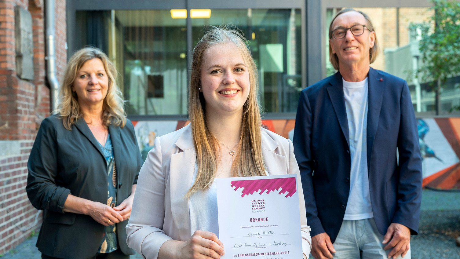 Saskia Möller war 2020 eine der Preisträger:innen. Prof. Heike Düselder (Museums-Direktorin und Vorsitzende der Lüneburger Universitätsgesellschaft, links) und Heiko Westermann (Sohn des Preisstifters) gratulierten.