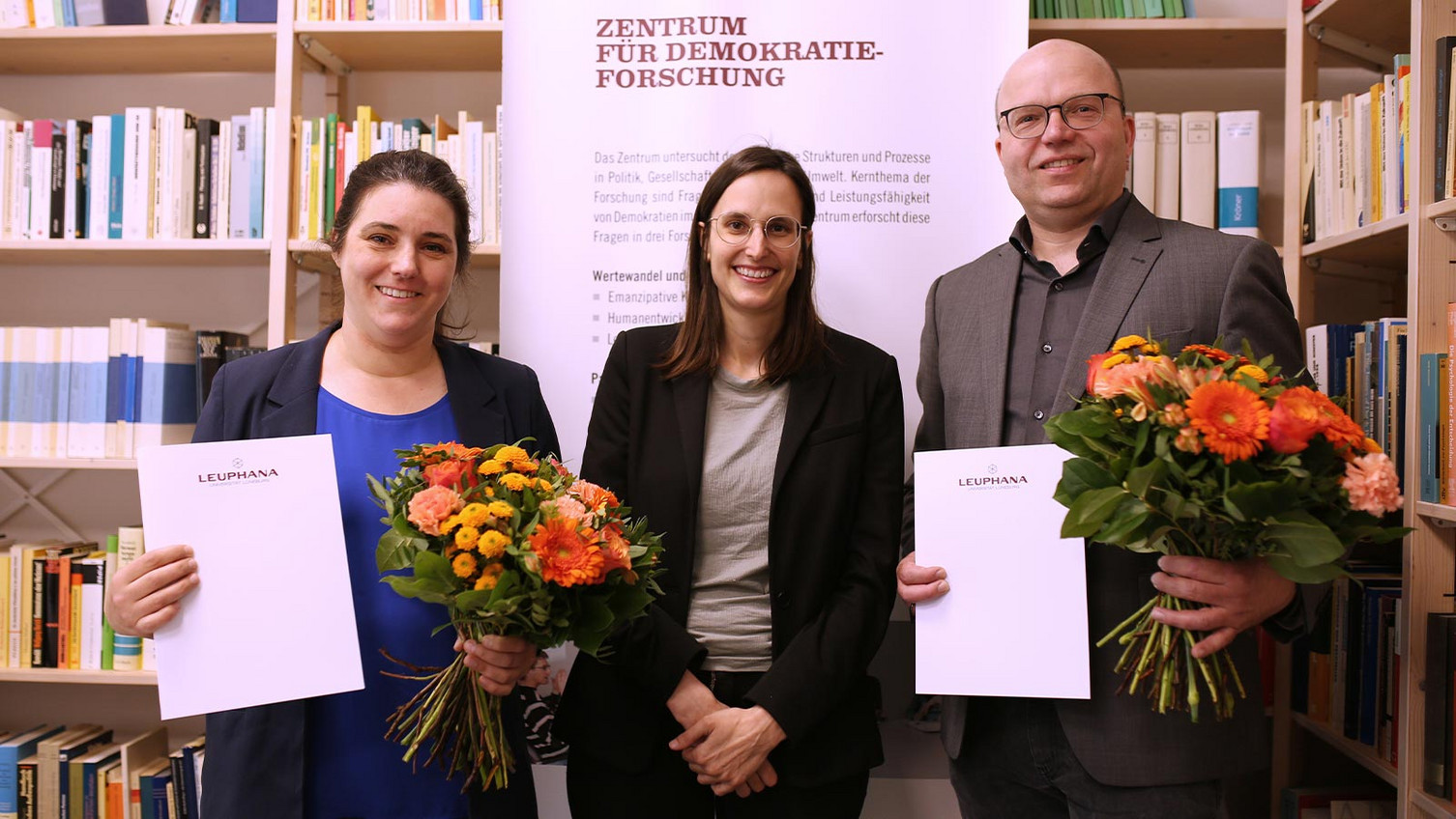 19.06.2024 Lüneburg/Hamburg. Die beiden Wissenschaftler:innen des German Institute for Global and Area Studies (GIGA), Dr. Miriam Prys-Hansen und Dr. Thomas Richter, sind von Universitätspräsident Sascha Spoun zu Honorarprofessor:innen bestellt worden. Am 7. Juni überreichte Prof. Dr. Sarah Engler, Direktorin des Instituts für Politikwissenschaften (IPW) der Leuphana, beiden ihre Ernennungsurkunden.