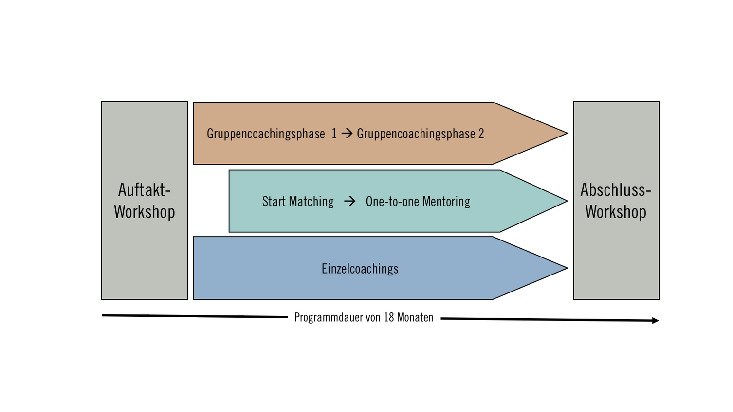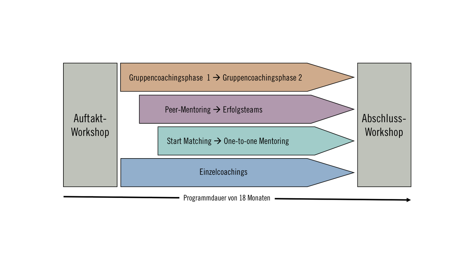 Es gibt zwei Gruppencoachingphasen. Die erste Phase ist verbindlich für alle Teilnehmerinnen und verfolgt das Ziel die individuelle Karriereorientierung zu fördern und die Teilnehmerinnen zur Selbstreflexion anzuregen. Die Coachings und Workshops nehmen daher die strategische Karriereplanung und -entwicklung in den Fokus. In der zweiten Gruppencoachingphase öffnet sich das Angebot und bietet die Möglichkeit der Fortbildung zu verschiedenen Themen wie z.B. Netzwerken, Umgang mit Herausforderungen in der Promotionsphase oder Work-Life-Balance. Weitere Informationen erhalten Sie unter Veranstaltungen und Termine.