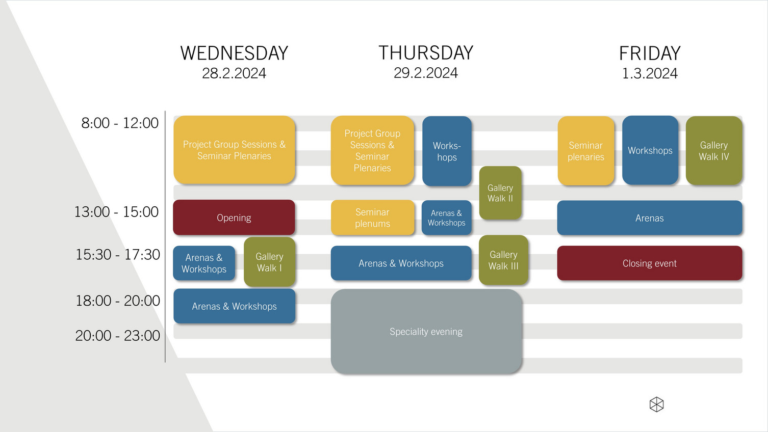 Arenas, Seminar plenaries, Project Group Sessions & Gallery Walks