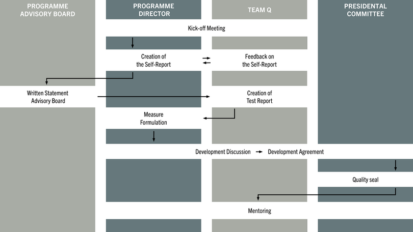 - Description of the study program: the so-called program folder documents all essential information about the study program. At the kick-off meeting, it is defined which person(s) in Team Q will provide feedback and support in the creation of the program folder. The completed program folder is sent to the program advisory board for evaluation.