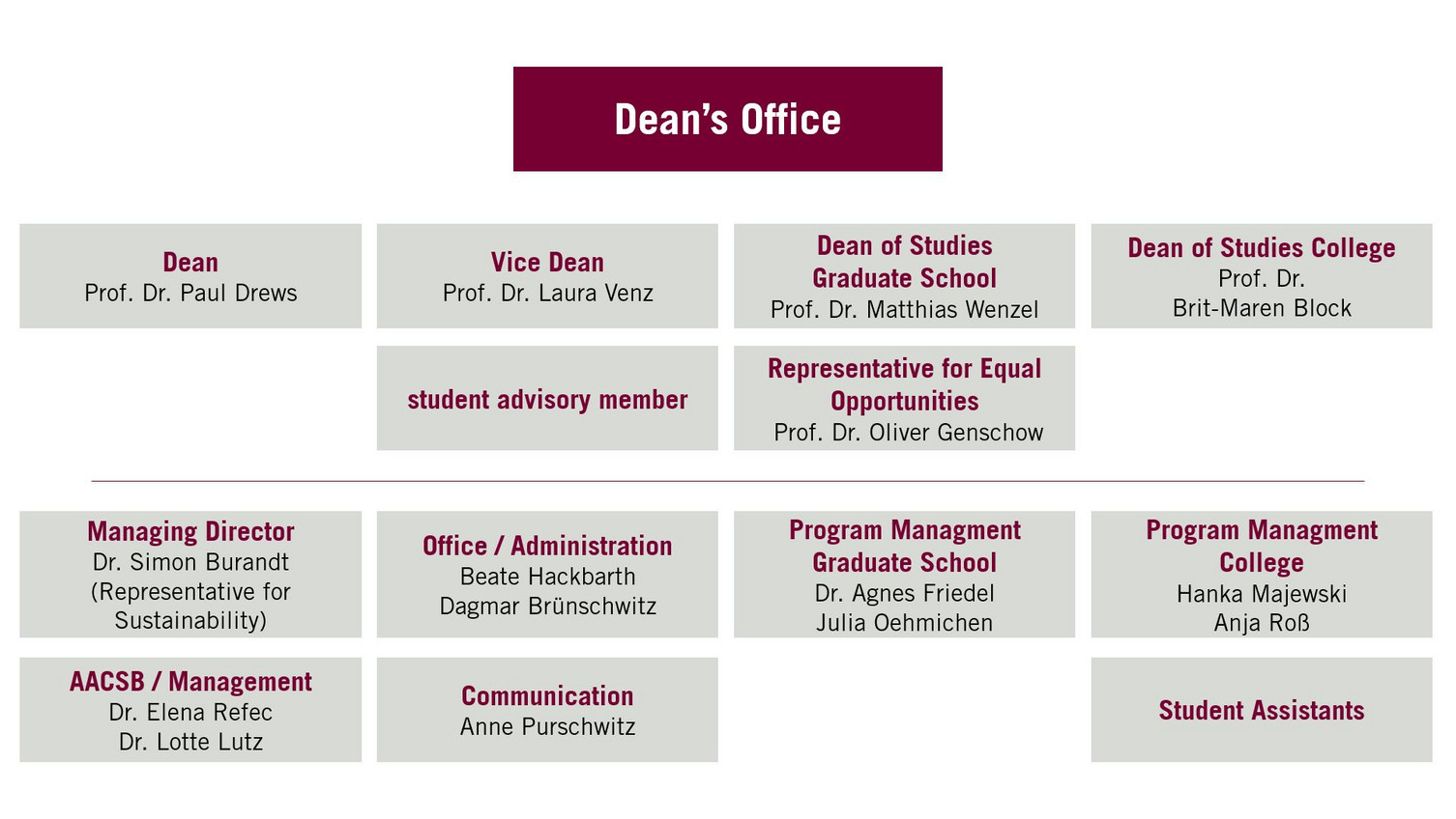 TThe Dean’s Office consists of the Dean, a Dean of Studies College (for undergraduate degree programs), a Dean of Studies Graduate School (for graduate degree programs) and a Vice Dean of Research. The team of the Dean’s Office provides support to strategic development and ensures the operational management of the school through services in the areas of studying and teaching, administration of matters relating to the doctoral programs, finance, personnel, organization and communication. The Deans of Studies and their team deal with your questions regarding your studies. The School of Management and Technology has also appointed three representatives for the cross-cutting issues of equal opportunities, quality management, sustainability and PRME.