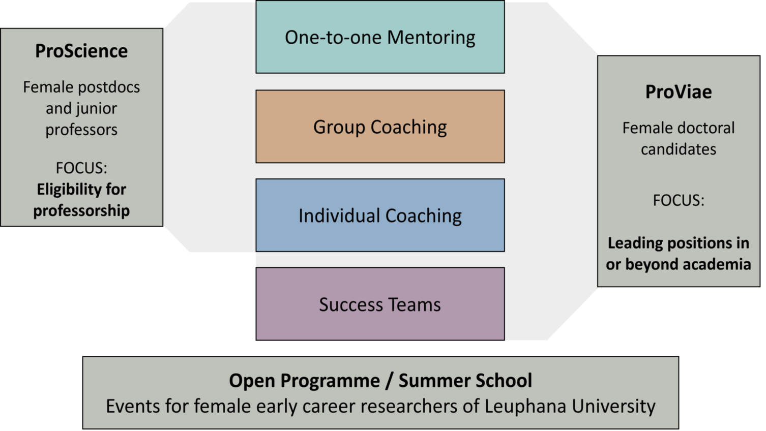 The Office for Equal Opportunities at Leuphana University offers a mentoring and coaching project to support female early career researchers on their way to professorship or to leadership positions outside of academia. This offer includes a wide range of support programmes and specific educational trainings.