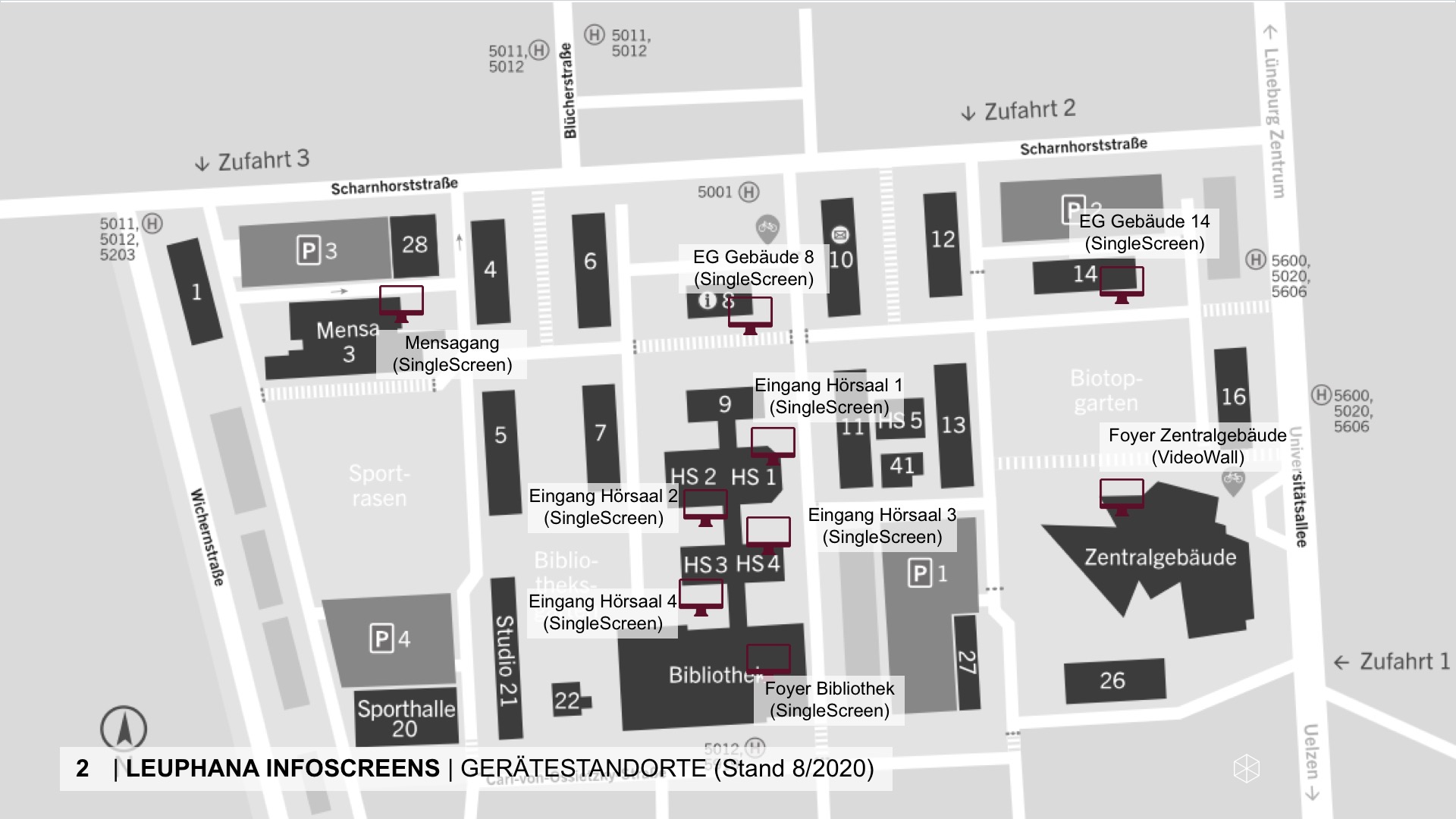 With the Leuphana InfoScreens, a communication channel (media type "digital signage") was created that can reproduce information via monitors in highly frequented places on the university campus. This fast, comprehensible and low-effort access to Leuphana communications was implemented for the university campus Universitätsallee and Rotes Feld. The use of the InfoScreens does not replace any of the usual information channels, but can supplement them in a targeted manner and refer to existing further information in other communication channels!