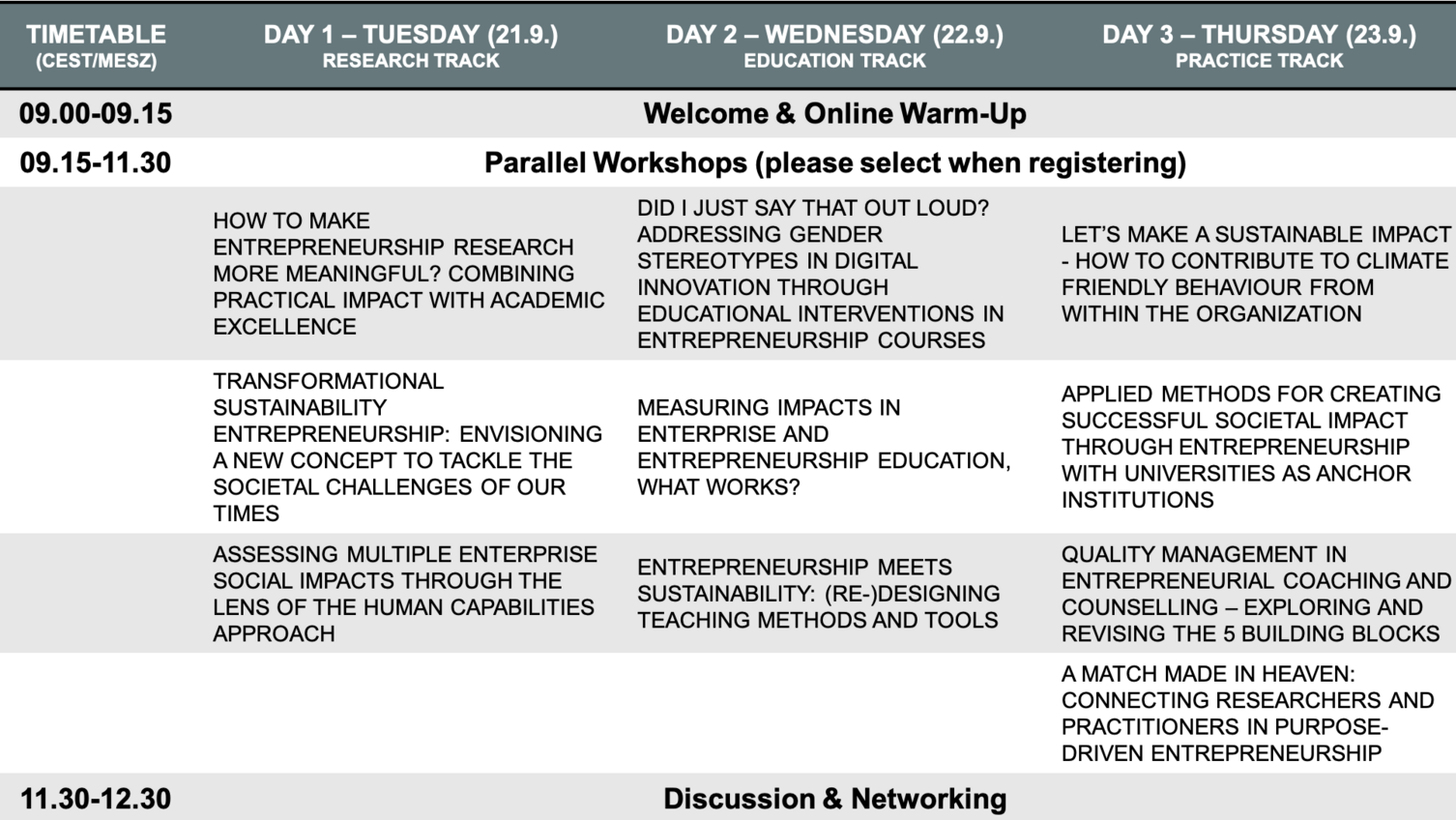 Thus, we will start with a brief introduction and welcome on each day. After this, participants are attending the workshop they have selected with the registration (we have 3-4 parallel workshops to choose from each day). Then, all participants come together for an interactive format to facilitate networking and discussion as this event wants to be a starting point for further discussing the role of impact-orientation in entrepreneurship research, education and practice. The whole event will be online via Zoom. Please note that a registration is required to participate in this event. When registering, you will be asked on how many days you would like to attend and asked to select a workshop. In the following, please find an overview of the program and afterwards the detailed workshop descriptions.