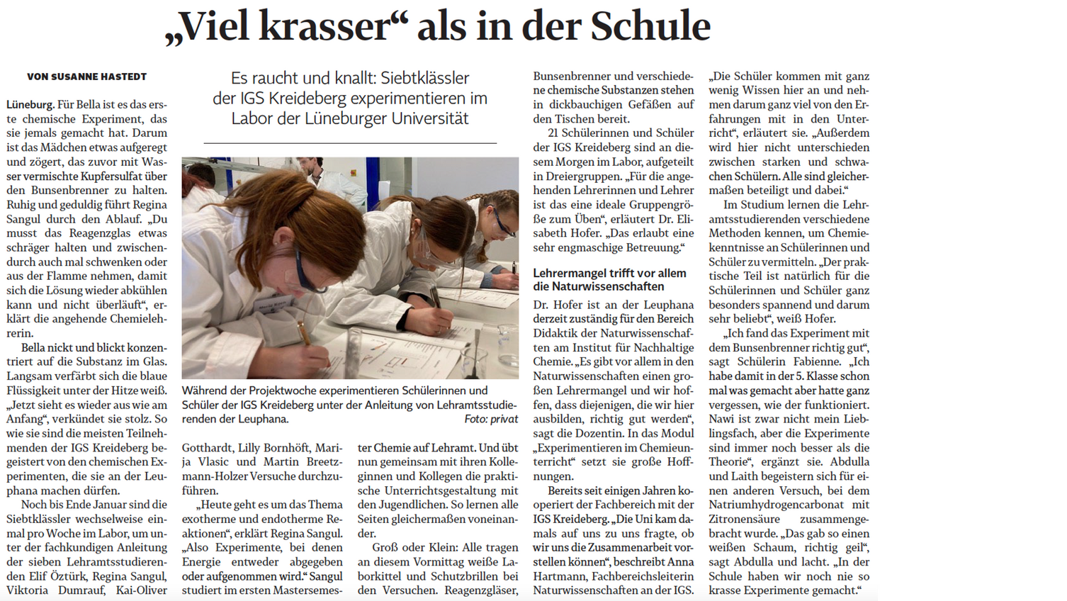 "In einer Welt, in der Vieles virtuell erklärt wird und vor Bildschirmen stattfindet, ist es umso spannender, wenn es real raucht und knallt. Neugier und Freude am Experimentieren zeigen Siebtklässler*innen der IGS Kreideberg, die im Labor der Leuphana chemische Experimente durchführen. Fachkundige Anleitung erhalten sie dabei von Lehramtsstudierenden." (S. Hastedt, LZ).