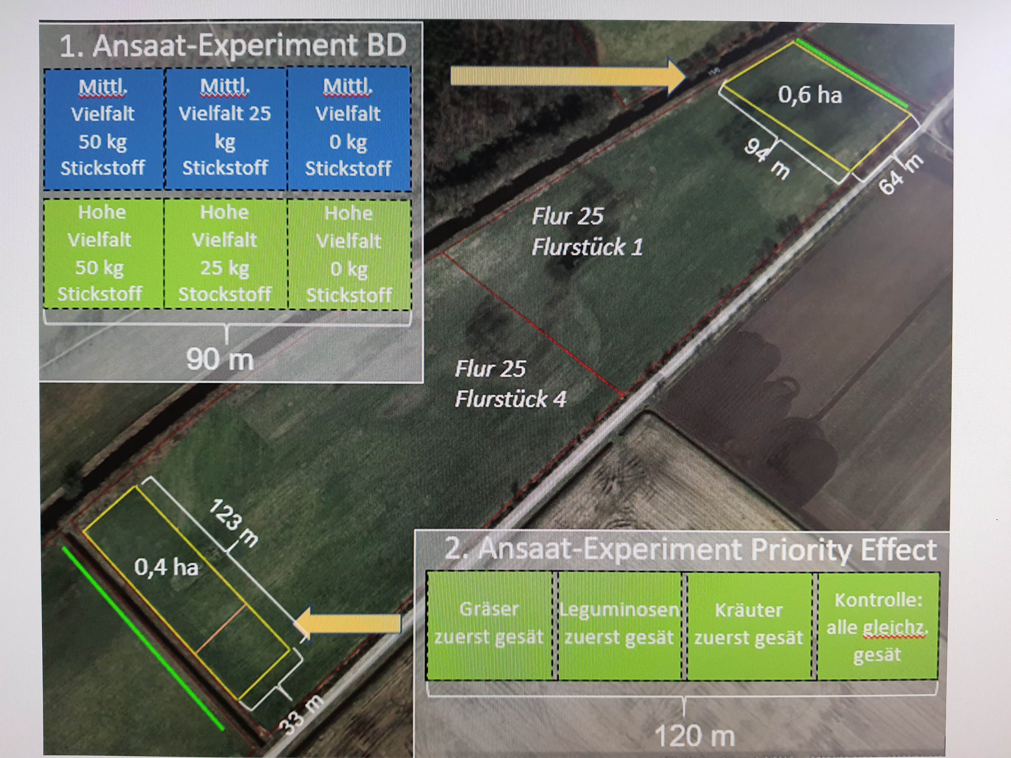 This project includes the following approach: You will sample 2-3 different designated grassland sites near Gifhorn, that Lunja Ernst and Ute Petersen are planning as key model biodiversity sites as part of the BfN-funded Grünlandvielfalt project (see https://aktion-fischotterschutz.de/newsdetail?tx_news_pi1%5Baction%5D=detail&tx_news_pi1%5Bcontroller%5D=News&tx_news_pi1%5Bnews%5D=229&cHash=f918237386c2d8c9510711083a61e95fHHere we are working closely with the local farmers who lease the land and harvest hay from the grasslands (that are degraded and not very species-rich due to old-fashioned restoration treatments carried out in the 1990s, but also a regaulr addition of around 50kg of N fertilizer over many years). In this project we will sample 2-3 of the sites planned for the biodiversity experimental treatments (see Figure below) to be set up this Sept/October. The main treatments that will happen in the near future are either sowing a high or a medium diversity seed mixture (after disturbing the soil to allow species to establish better) and adding no fertilizer, 25 or 50 kg N per hectare per year. This will allow us over time to assess whether we can increase the plant diversity at the site, and whether removing fertilizer and or adding high diversity seed mixtures works best in terms of restoration outcomes.