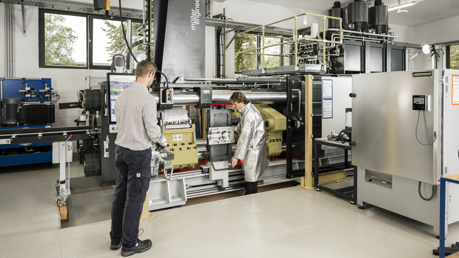 Flexible Forschungsstrangpresse für NE-Metalle mit Möglichkeiten des direkten Strangpressens mit fester und loser Pressscheibe sowie indirektes Strangpressen mit beweglichem Dorn für variable Wandstärken.