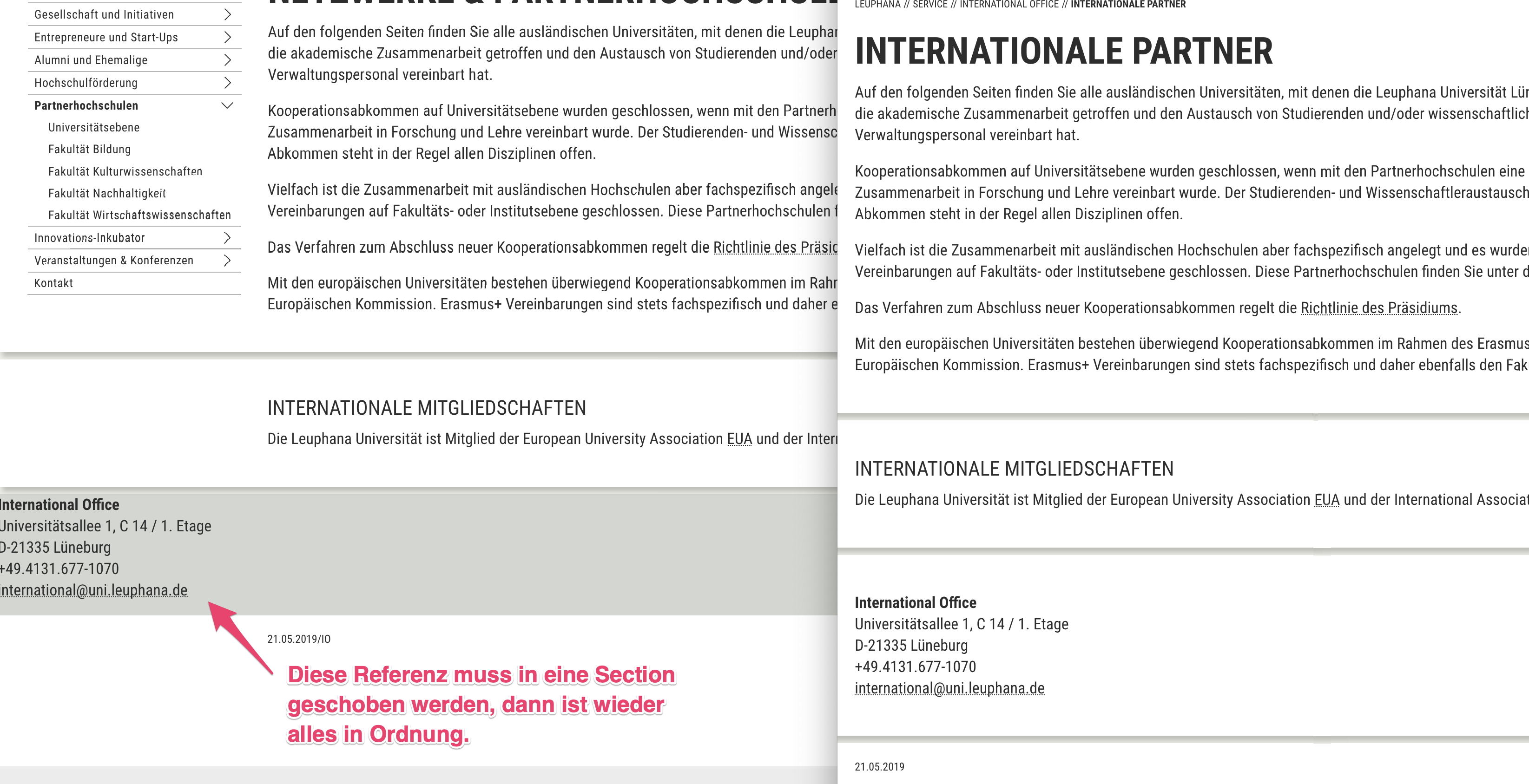 - Die Referenz einer Section (eines Rasters) liegt direkt auf der Seite. Dann darf der Titel nicht als Überschrift eingeblendet sein – die Überschrift muss also in der Quelle festgelegt werden!