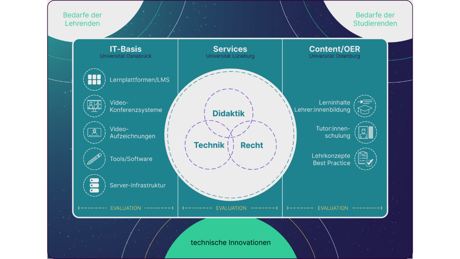 Mit der intensiven Nutzung digitaler Lerntechnologien in den vergangenen Semestern sind Erfahrungswissen und digitale Kompetenzen, aber auch didaktische, rechtliche sowie technische Bedarfe und Anforderungen massiv gestiegen. Orientiert am Zielbild der digitalen Souveränität haben sich die Verbundpartner zusammengeschlossen, um durch Bündelung ihrer Kompetenzen und Leistungen in den Bereichen IT-Basis, Services und Content den gestiegenen Anforderungen dauerhaft gerecht werden zu können.