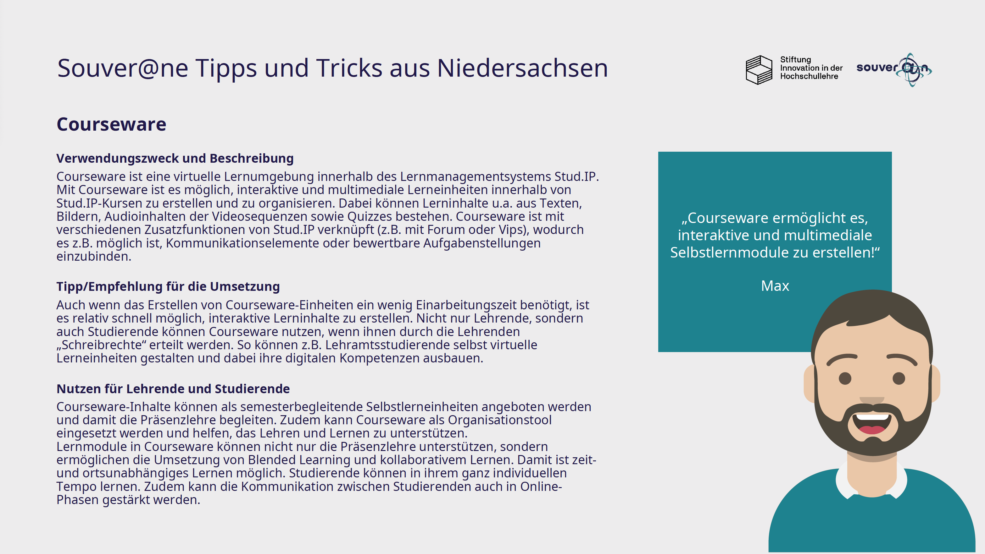 In dieser Rubrik stellen Mitarbeitende des Verbundprojektes SOUVER@N digitale Tools vor, die aus ihrer persönlichen Sicht besonders geeignet sind für den Einsatz in der digital gestützten Lehre, für die Gestaltung der digitalen (Zusammen-)Arbeit und für die Erleichterung des Arbeitsalltags. Alle zwei Wochen erscheint an dieser Stelle ein neuer Tipp. Schauen Sie gelegentlich vorbei und lassen Sie sich von den vielfältigen Möglichkeiten der digitalen Lehre inspirieren.