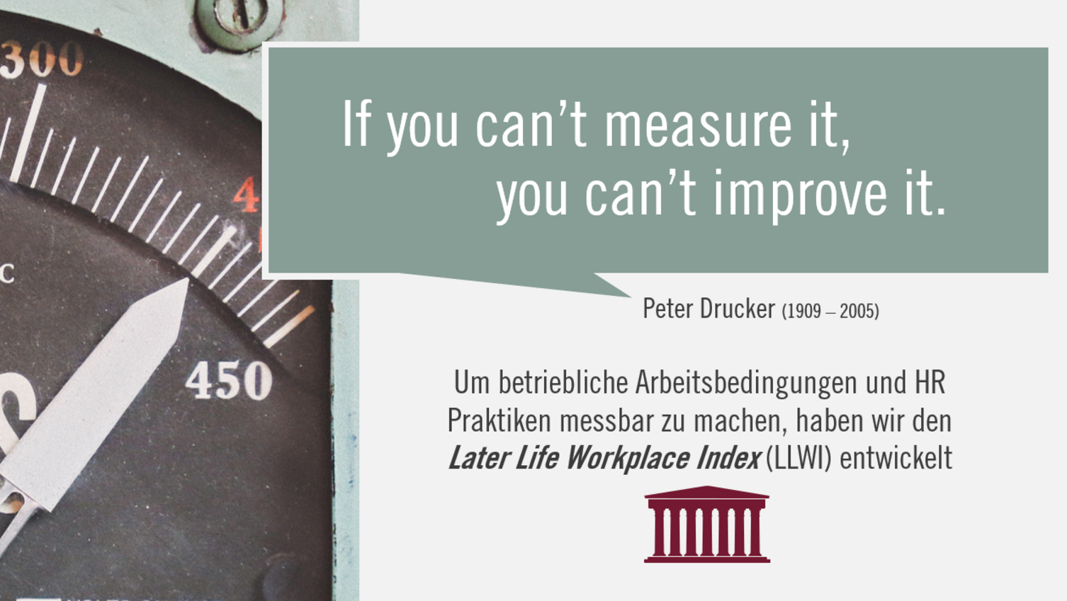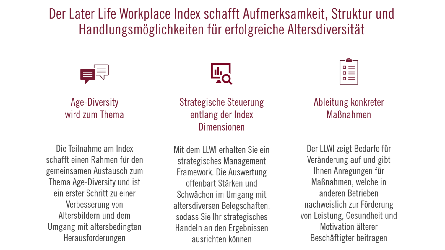 Wie sieht eine Organisation aus, in der Arbeiten im Alter und Arbeiten in altersdiversen Teams erfolgreich ist? Dieser Frage geht der Later Life Workplace Index auf den Grund. Ziel ist es, betriebliche Praktiken und Arbeitsbedingungen aufzuzeigen und messbar zu machen, um Arbeitsleistung, Motivation und Gesundheit älterer Erwerbstätiger zu erhalten.