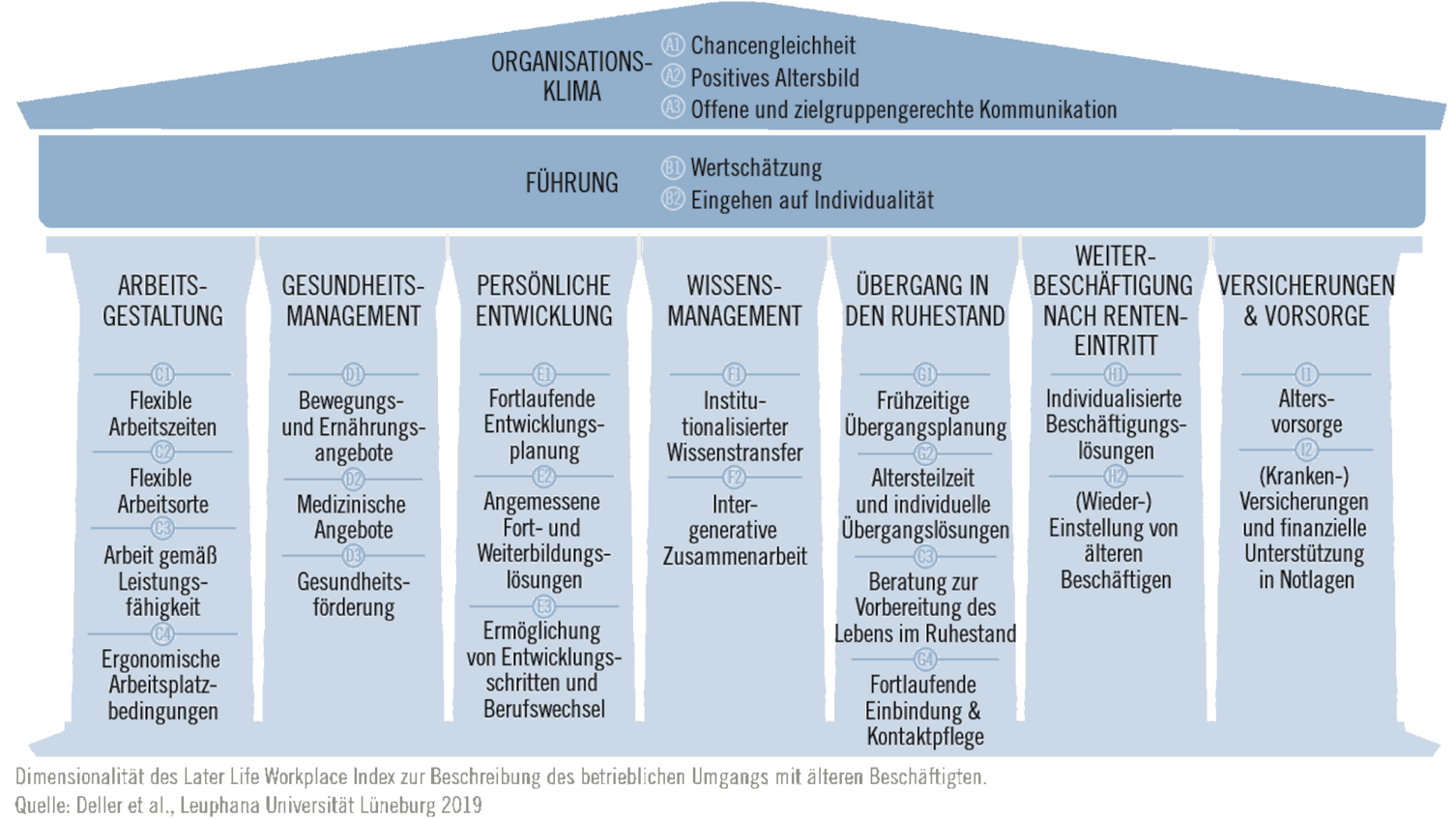 Die neun Dimensionen des Later Life Workplace Index (LLWI) erfassen Facetten des betrieblichen Umgangs mit altersdiversen und alternden Belegschaften. Dabei werden explizit sowohl weiche Faktoren wie Organisationsklima und Führung als auch harte Faktoren wie eine alternsgerechte Arbeitsgestaltung und der Übergang in den Ruhestand berücksichtigt. Nicht alle Faktoren sind ausschließlich für ältere Beschäftigte relevant. Viele dienen einer erfolgreichen Beschäftigung altersgemischter Belegschaften.