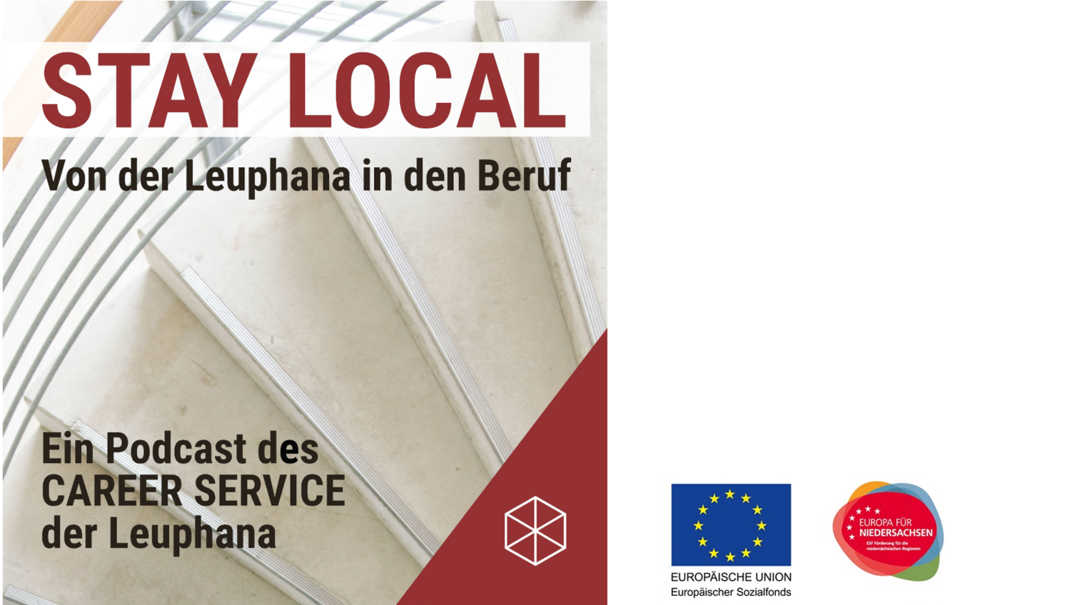 In unserem Stay Local Podcast, der im Rahmen des ESF-geförderten Projekts "Regionale Perspektiven - Von der Hochschule in den Beruf" entstanden ist, nehmen wir Sie in jeder Folge mit auf eine 30-minütige Reise mit Arbeitgebern der Region. Sie erhalten Einblicke in spannende Unternehmen, interessante Tätigkeitsfelder und erfahren von Mitarbeiter*innen oder Alumni der Leuphana wie sie den für sie passenden Berufseinstieg gestaltet haben.