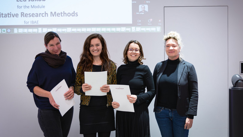 - Dr. Sünje Helldorf, Leonie Eising, Dr. Sarah Stanske, Lena Kostuj und Lea Jakob im Modul „Qualitative Research Methods“ (IBAE)